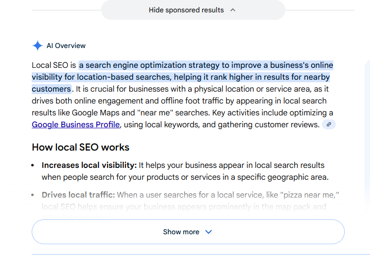For example, rather than visiting a blog post for “what is local SEO,” a user may see a short answer block and then move on.